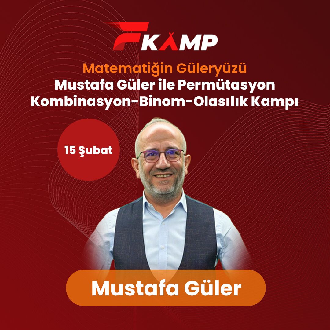 Matematiğin Güleryüzü Mustafa Güler ile permütasyon, kombinasyon, binom ve olasılık konularını 1 günde netleştiriyoruz. TYT, AYT, MSÜ, KPSS, ALES ve DGS’ye yönelik yoğun anlatım, bol örnek ve pratik odaklı bu full gün kamp; “buradan soru gelirse yapamam” dediğin konuları bitirmen için tasarlandı.